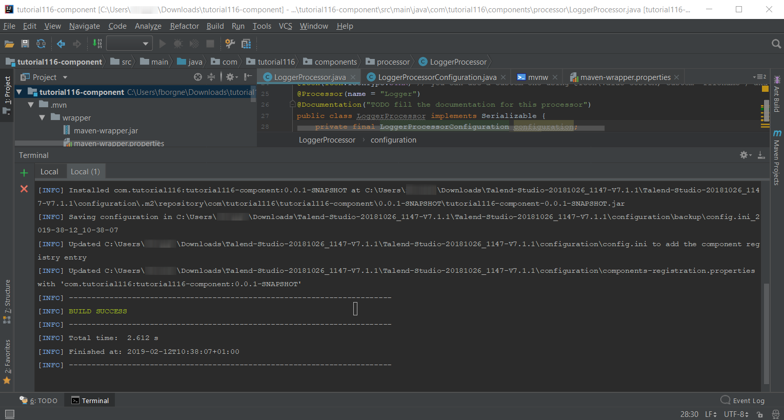 Once the command is executed and you see BUILD SUCCESS in the terminal, deploy the component to your local instance of Talend Open Studio using the following command: