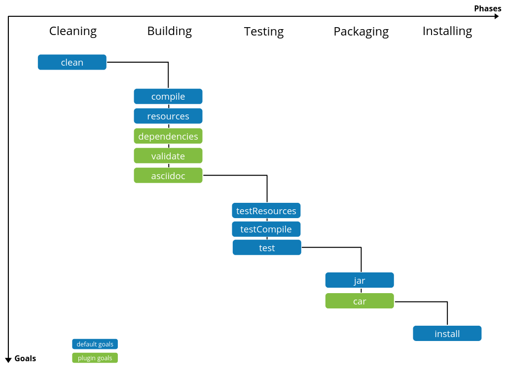 The build is split into several phases. The different goals are executed in the order shown above. Talend Component Kit uses default goals from the Maven build lifecycle and adds additional goals to the building and packaging phases.