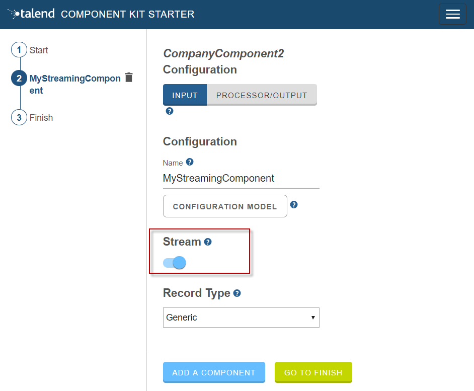 You can enable streaming right from the design phase of the project by enabling the Stream toggle in the basic configuration of your future component in the Component Kit Starter.